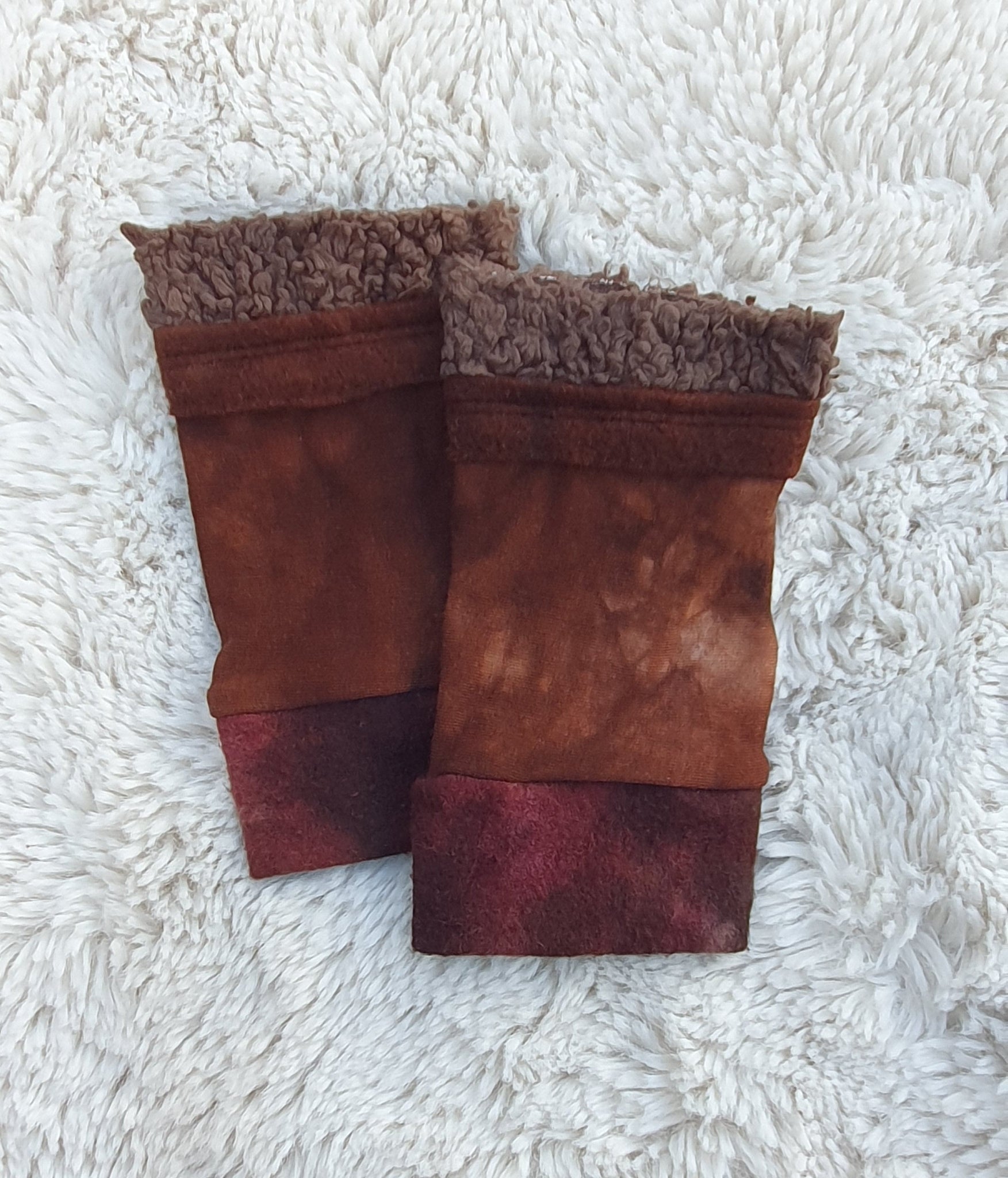 Handdyed in brown (cotton sherpa), chocolate brown (fleece) & deep burgandy / black band.